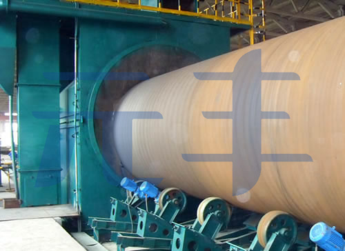 拋丸除銹機(jī)是利用高速旋轉(zhuǎn)的拋丸器帶動(dòng)彈丸并使之加速同時(shí)拋出,打擊鋼管外壁,去除鐵銹、軋鋼鱗片、油脂、灰塵、漆、水分或其他沾染物。從而達(dá)到去除焊接應(yīng)力,增加鋼管表面的錨紋深度,增強(qiáng)鋼管表面的附著力,有效增強(qiáng)了聚氨酯保溫層與鋼管的粘接力,有效保證了工作鋼管、聚氨酯保溫層和聚乙烯外護(hù)管達(dá)到三位一體的結(jié)構(gòu)。鋼管拋丸除銹對(duì)確保聚氨酯保溫管結(jié)構(gòu)的一體化,增強(qiáng)管中管系統(tǒng)的嚴(yán)密性及可靠性,延長(zhǎng)保溫管的使用壽命有著不可忽視的意義。